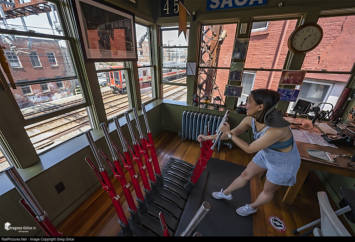 A SONO Switch Tower Museum guest playing Tower Operator hastily throws one of several mechanical levers to put in a signal for a westbound Metro-North train as it approaches BERK (SS44) on the New Haven Line in South Norwalk.