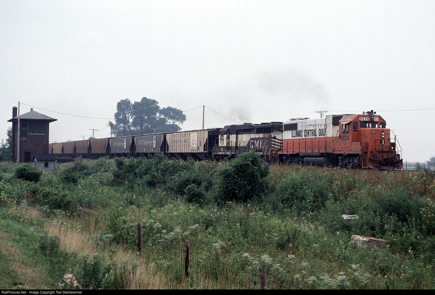 In August 1978, my father and I drove down to Beaverville, Illinois from Chicago to see the former N&W RS11s on the then recently formed Kankakee, Beaverville, and Southern. On our way there, we spotted this northbound Illinois Central Gulf unit grain train, shown here passing Otto Tower in Otto, Illinois. ICG GP38-2 9634 leads GP30 511 still wearing GM&O paint. R. T. Steinbrenner Photo.