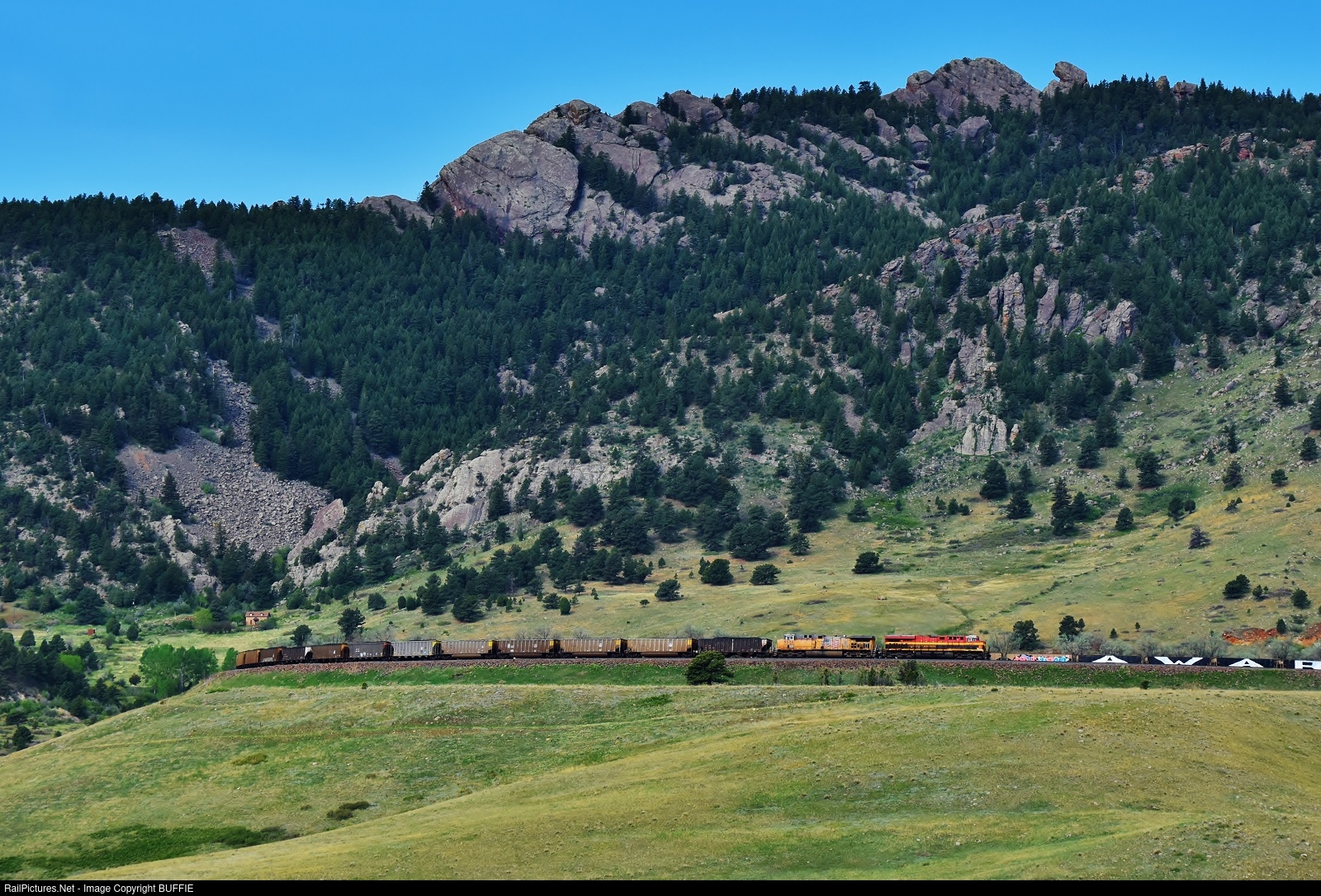 Kansas City Southern 4765 (ES44AC) leads a Union Pacific train through Big Ten Curve as it drops down grade on the Moffat Tunnel Sub.