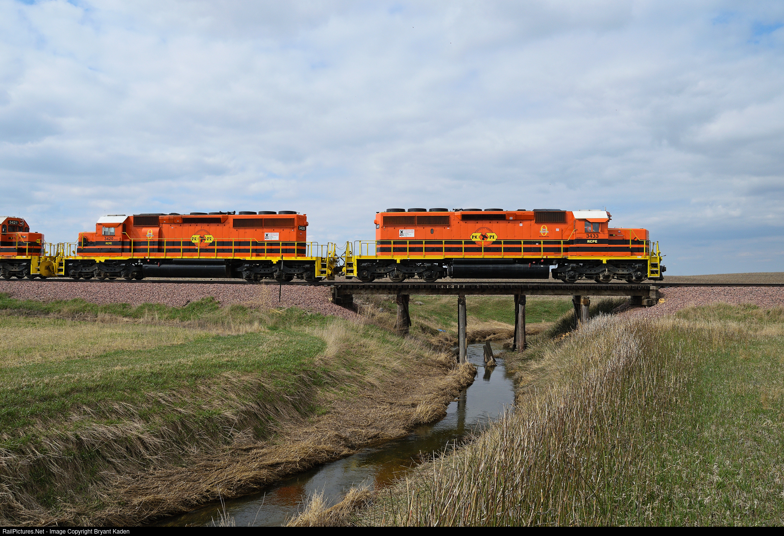 | An eastbound Rapid City, Pierre & Eastern train crosses an irrigation ditch west of Balaton, MN as the sun poke through the cloud cover. |