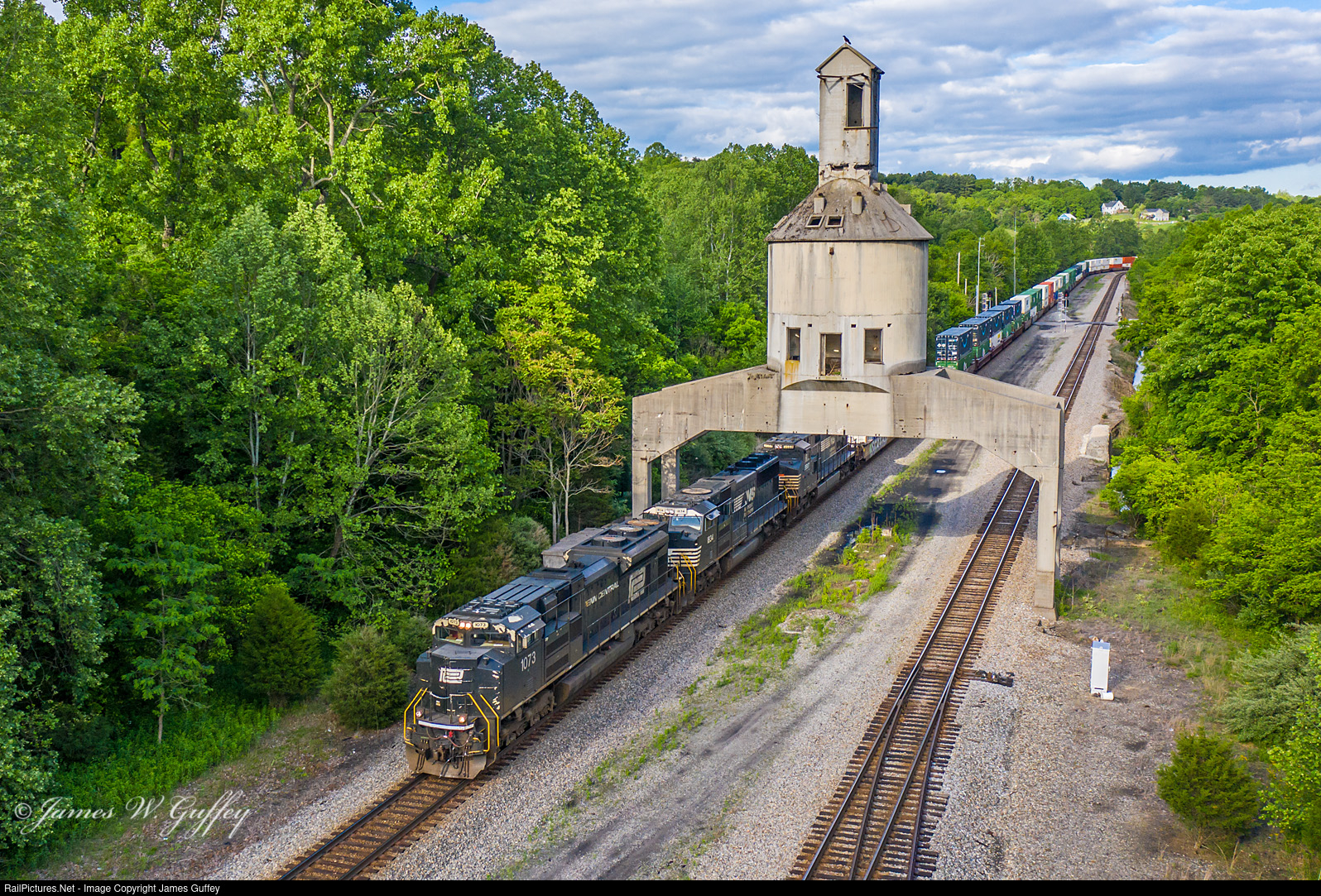 A crow has a bird's eye view as the Penn Central Heritage Unit leads Charlotte-Chicago intermodal 217 through an overtake of 19M at the coaling tower at Vicker.