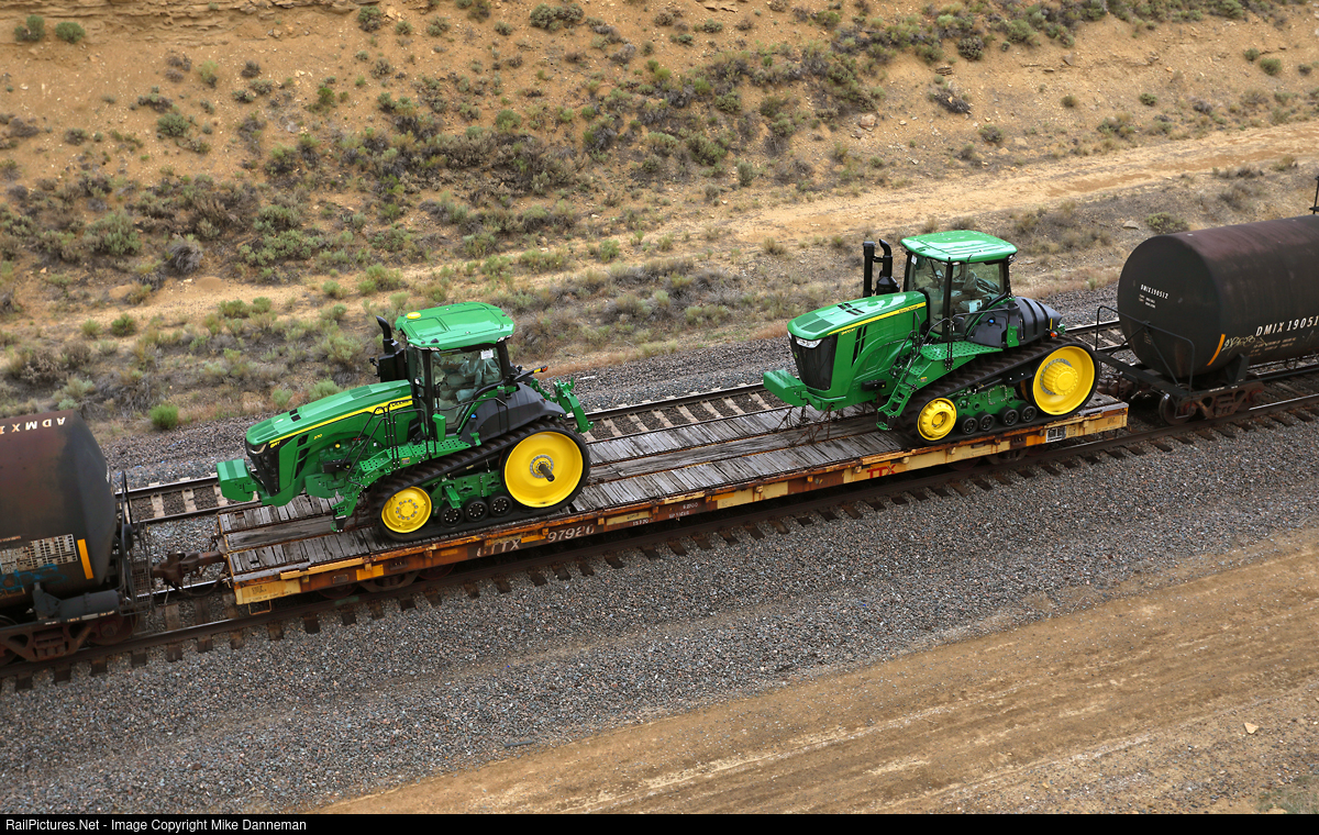 A westbound Union Pacific manifest freight climbing Peru Hill west of Green River, Wyoming, has TTX flat No. 97920 carrying a pair of two-track John Deere tractors in the consist. On the left is a 370 hp 8RT model, while on the right is a larger 9470RT, at 470 hp and often used for pulling a scraper.