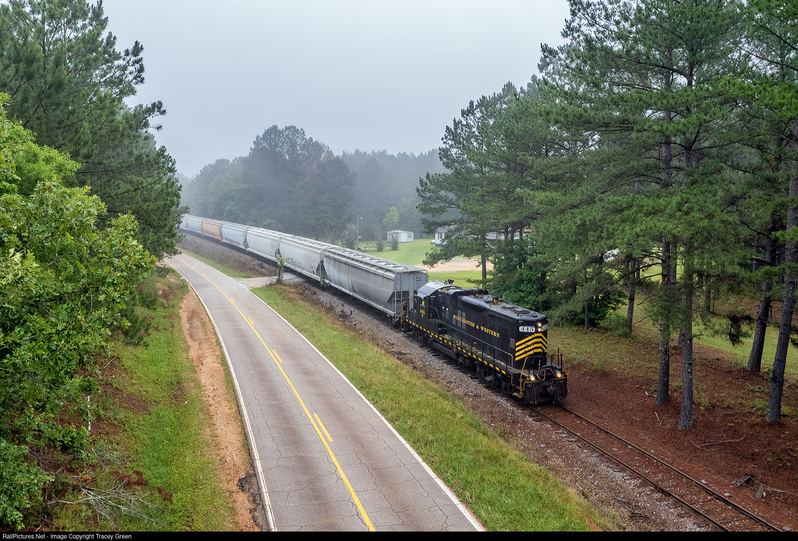 | Rounding the Bend. On a foggy morning, the day's Georgia Woodlands run to the CSX Interchange at Barnett rounds the bend. |