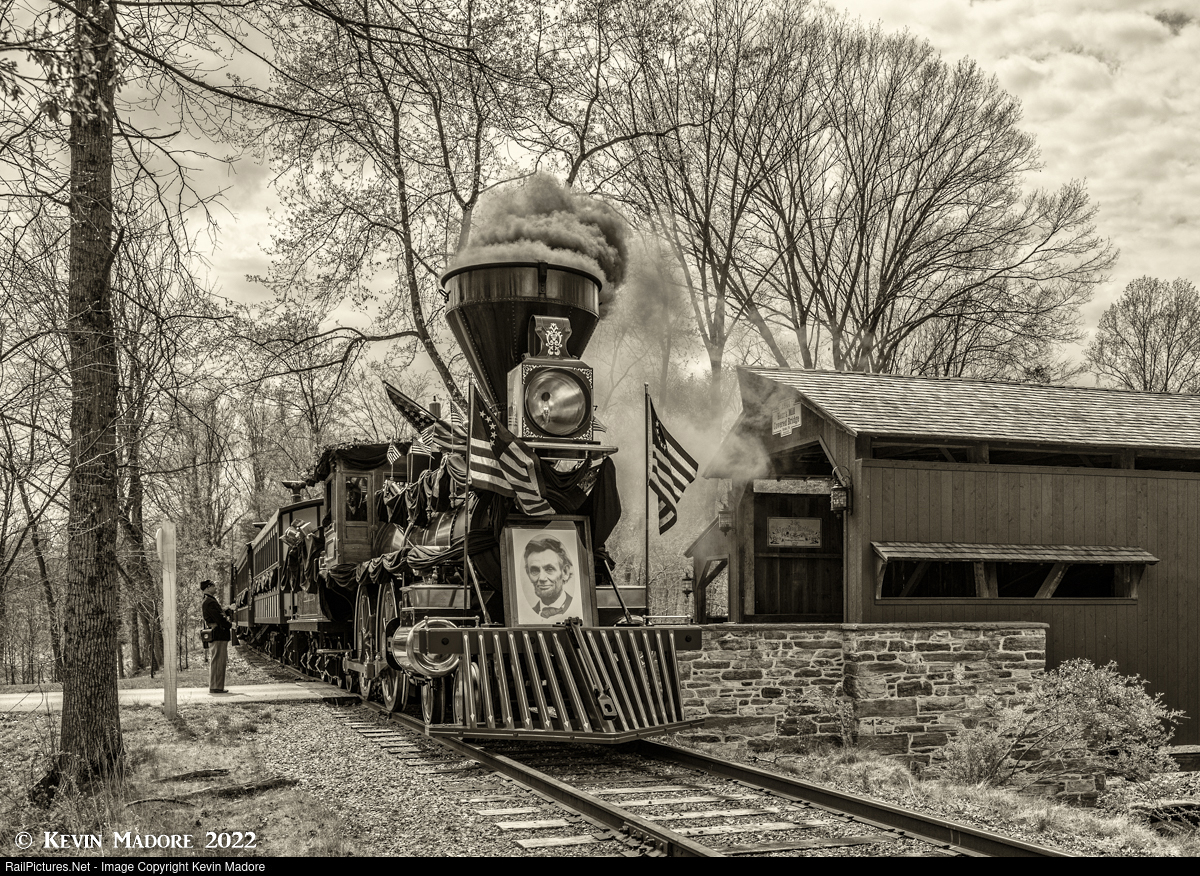 A time-warp in Elizabethtown, PA. With Federal Troops rendering honors, the 2022 re-enactment of the Lincoln Funeral Train passes one span of the Herr's Mill Covered Bridge, on its journey eastward toward Ironstone Station, not far ahead.