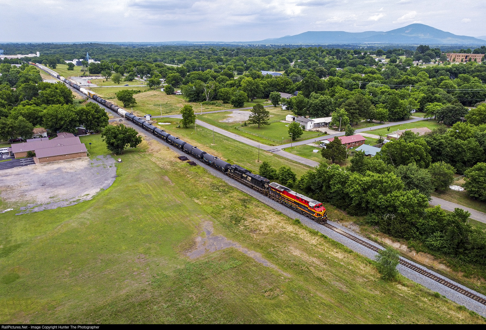 Southbound manifest train MKCSH-6 rolls through Poteau, OK on the afternoon of June 6, 2022. In the background - due east from Poteau - are the Sugar Loaf Mountains, a small group of peaks on the OK-AR border topping out at 2,562 feet above sea level.
