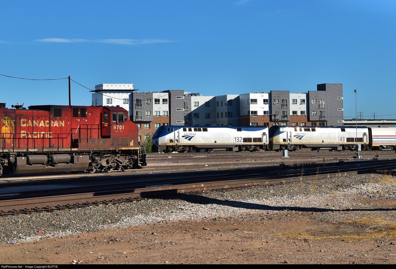 | Amtrak engine 132 (P42DC) leads the California Zephyr through the Denver Yard and passed a Canadian Pacific engine waiting to head to a train.