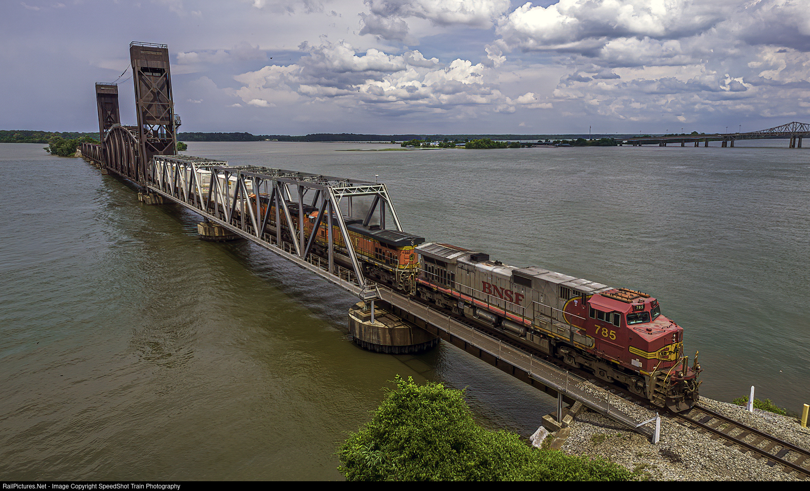 BNSF 785 Leads a 3 unit Intermodal across the Tennessee River Westbound (South) on a stormy and sunny mixture of weather in Alabama