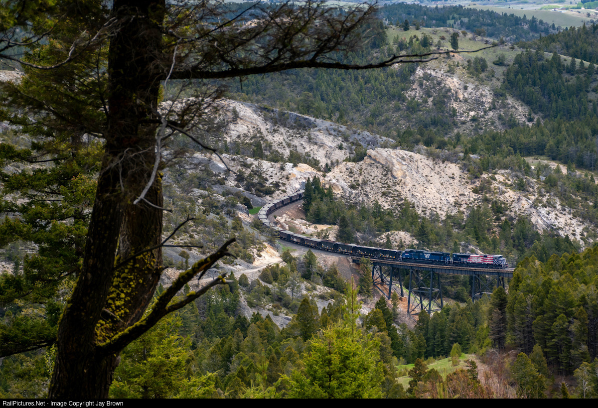 Wrapped up in a Veterans memorial livery, the MRL 4407 crawls over Skyline Trestle with a long set of loaded ballast cars in tow. With maintenance of way season in full effect, the 4th sub was in need for some new ballast work.