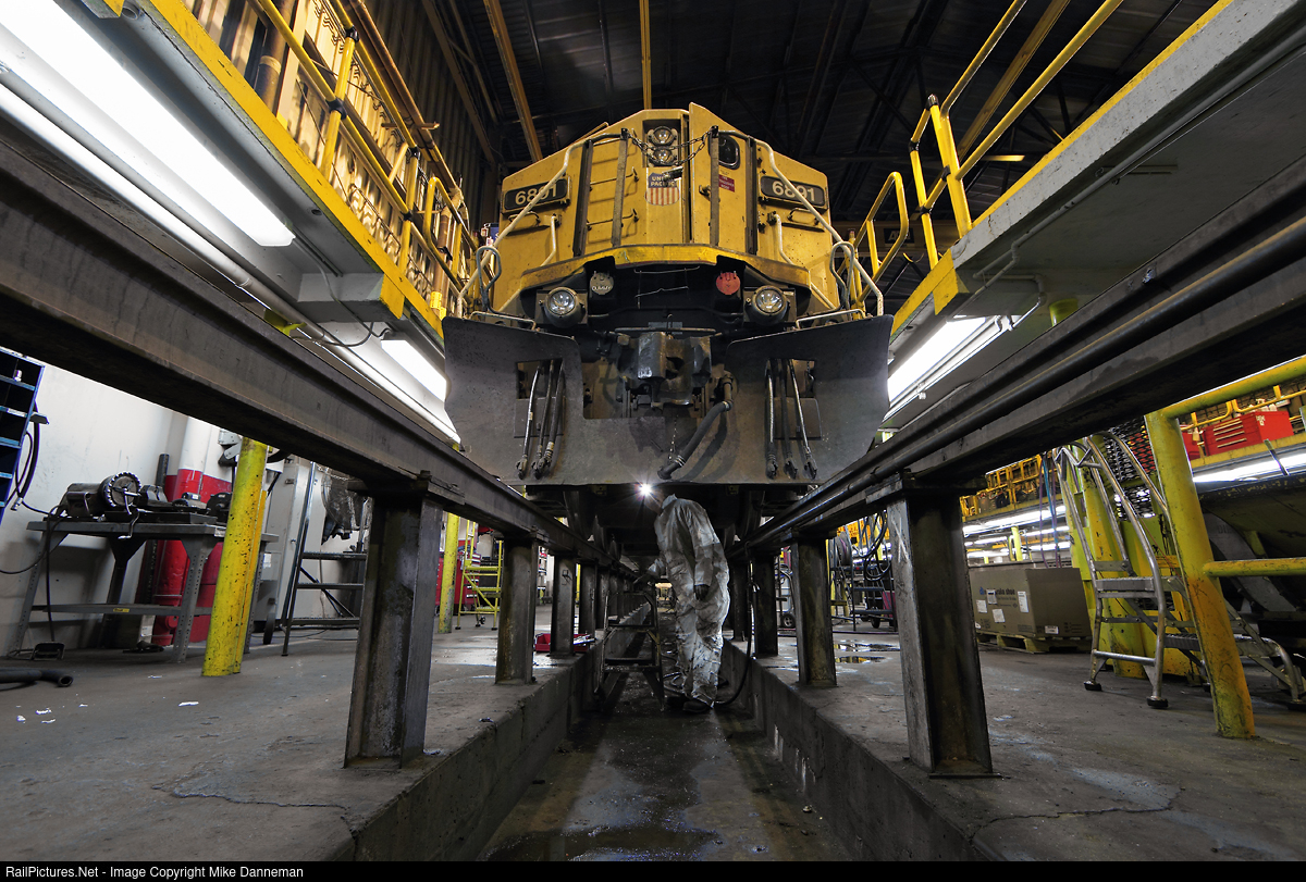 Union Pacific GE AC4400CW No. 6891 gets an inspection over the pits in the Diesel House at UP’s Burnham Shops in Denver, Colorado, on December 16, 2015.