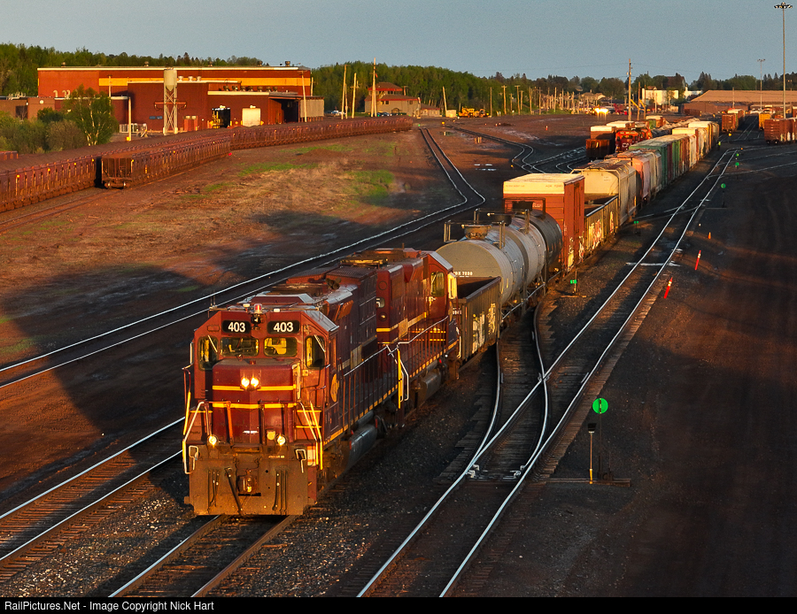 | Golden hour sunlight highlights the last two remaining DM&IR painted units on CN's roster. SD40T-3 403 and SD38-2 215 kick cars at the north end of Proctor Yard, with the old Iron Range diesel house standing in the background. |