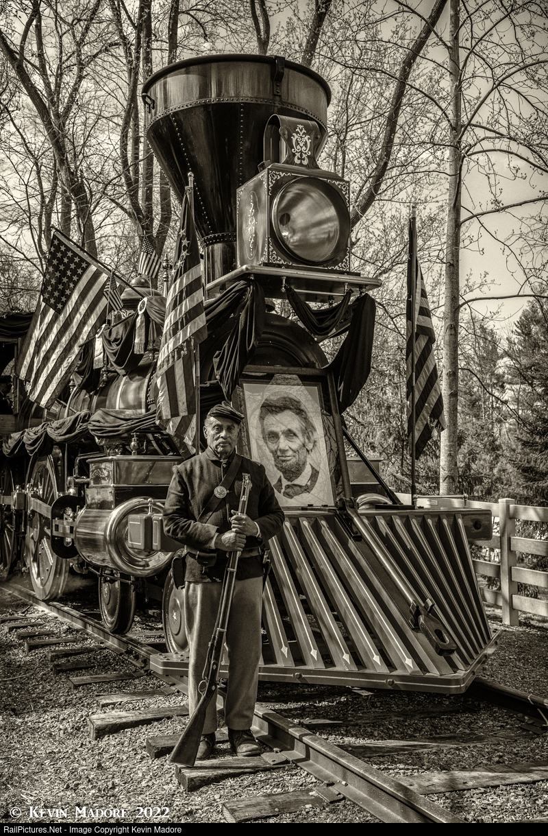 A soldier mourns his fallen leader. A Federal Soldier from the 54th Massachusetts poses for a portrait with the train bearing the body of his fallen Commander-in-Chief, Abraham Lincoln.