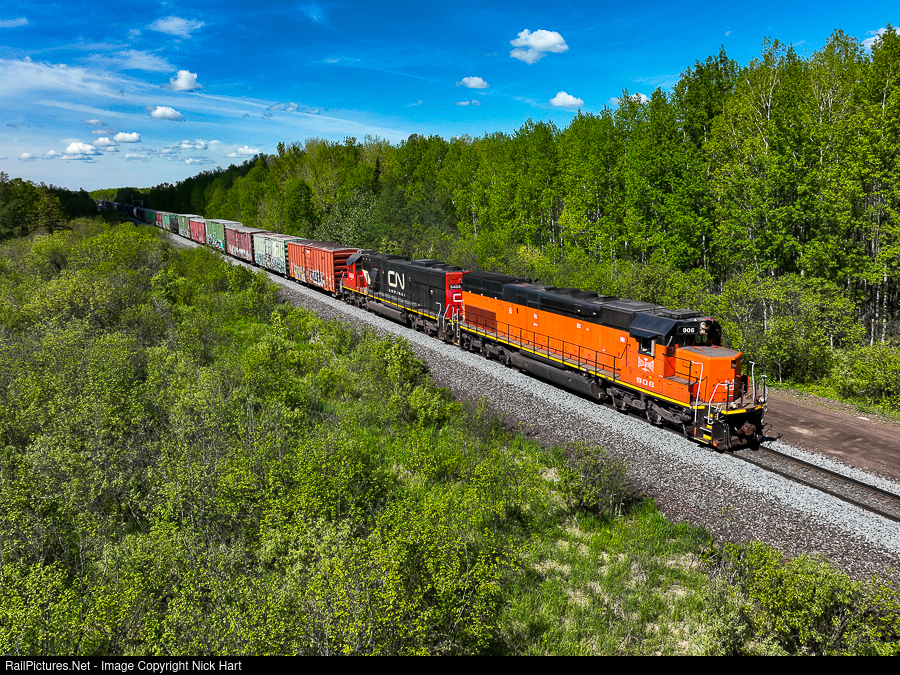 | Just ahead of an approaching cloud, BLE 906 and CN 5459 head north through Wolf, MN. |