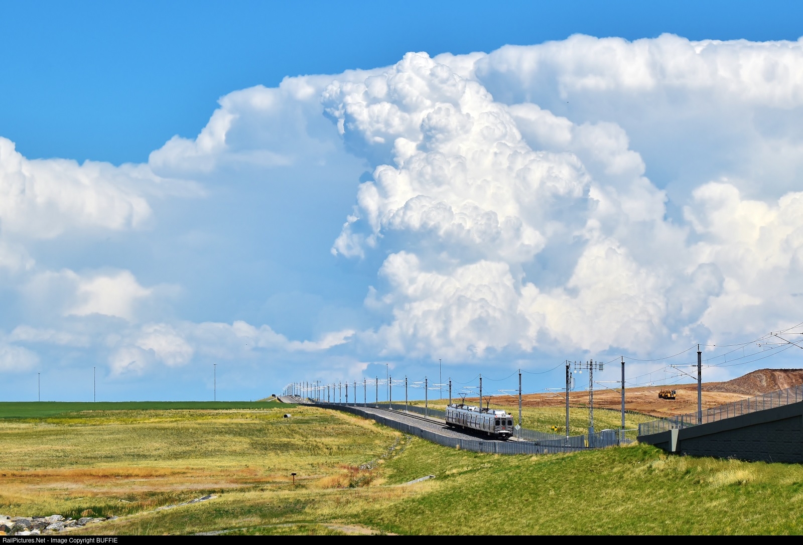 | With a massive thunderstorm cell looming in the background, RTD 4030 (Hyundai Eagle) runs on the commuter rail line linking Denver International Airport with downtown Denver. |