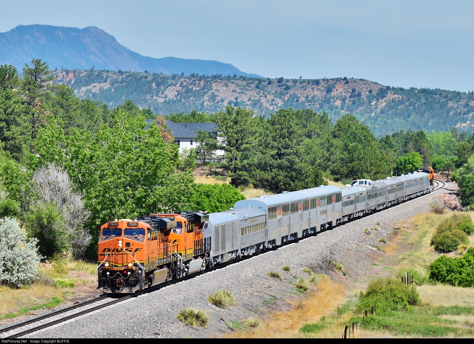 BNSF 7529 (ES44DC) leads an officer's special train with an interesting variety of passenger cars.