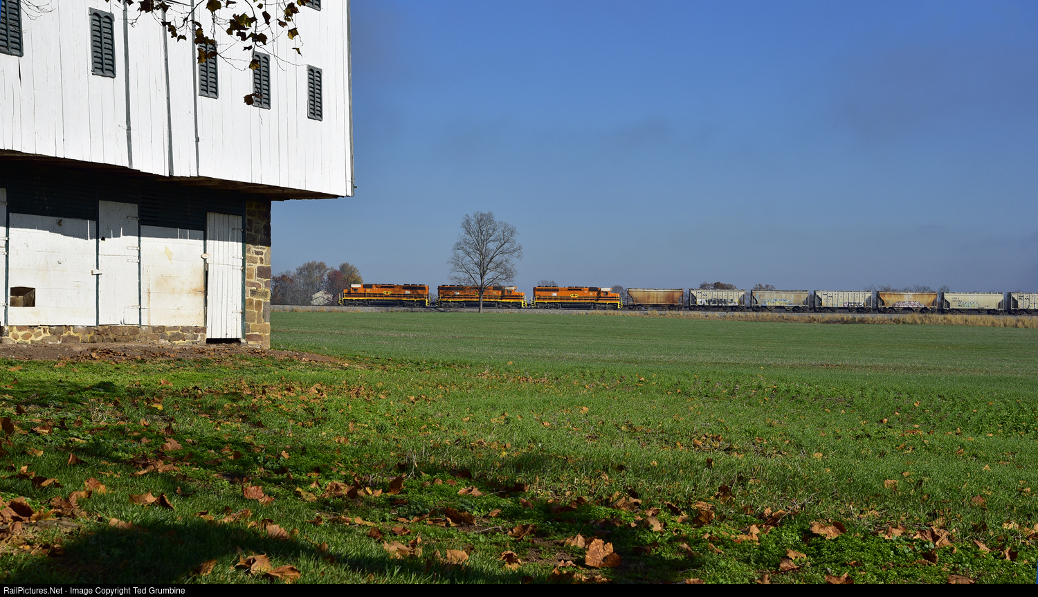 “Hold Your Horses” MMID 3449 leads Maryland Midland’s UBHF, with 50 Lehigh cement loads–west, out of the Monocacy River valley and through the farmland just east of Rocky Ridge proper. Three SD40 2s are pulling, and two manned helpers (MMID GP38-3s2060 and 2061) are shoving on the rear. The helpers aren’t really required right here—but they will be—when the train attacks Catoctin Mountain west of Thurmont on the former WM East Sub.