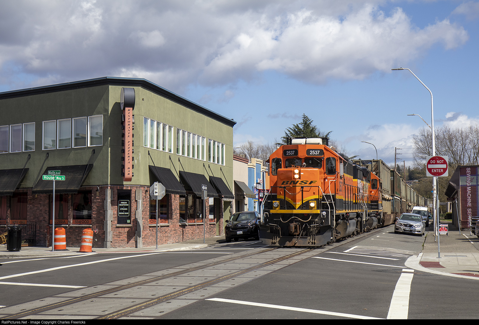 | Where Milwaukee boxcab electrics once roamed, the BNSF Renton Rocket (all trash cars this day) heads over street running in downtown Renton. |