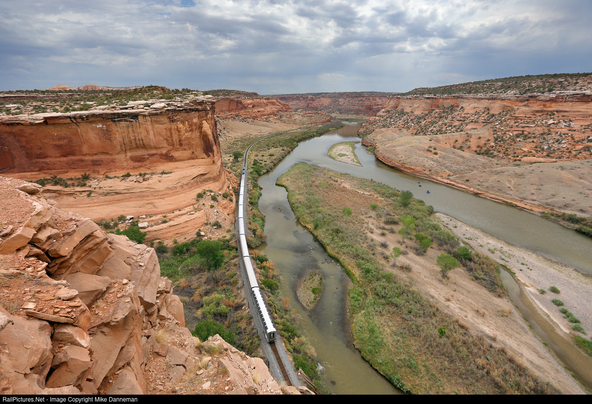 Amtrak train 6, the eastbound California Zephyr, crosses over McDonald Creek at the base of imposing Dodge’s Bluff just east of Utaline, Colorado, in impressive Ruby Canyon on June 23, 2021. Unusual, the Sightseer Lounge is located on the rear of the train.