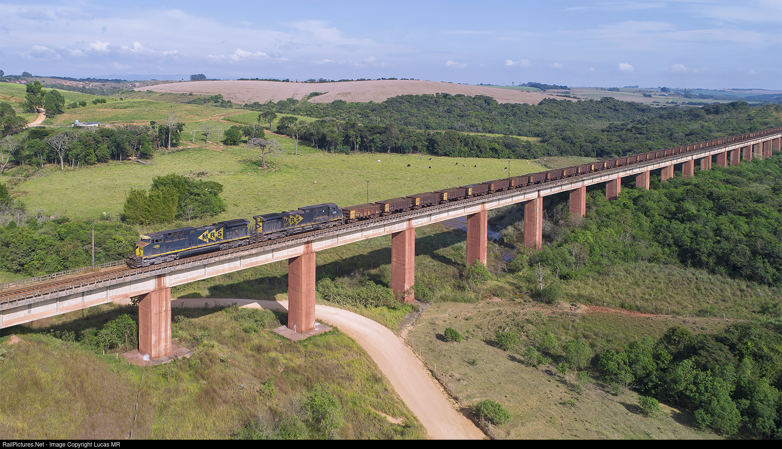 A southbound ore train NAG0222 traveling through Ferrovia do Aço, photographed on viaduct #60, near Itutinga-MG