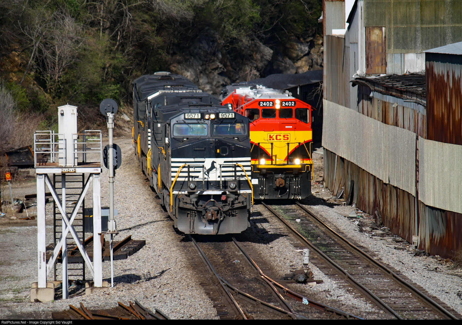| A set of power has come down from Shaffers Crossing headed for South Yard (former Virginian). This entails running down the Winston Salem line, reversing on the connection onto the former VGN then heading west to the yard. Here a KCS GP22ECO Is on loan for adhesion testing on Starkey Hill. 9571 is awaiting a signal for the westbound move. |