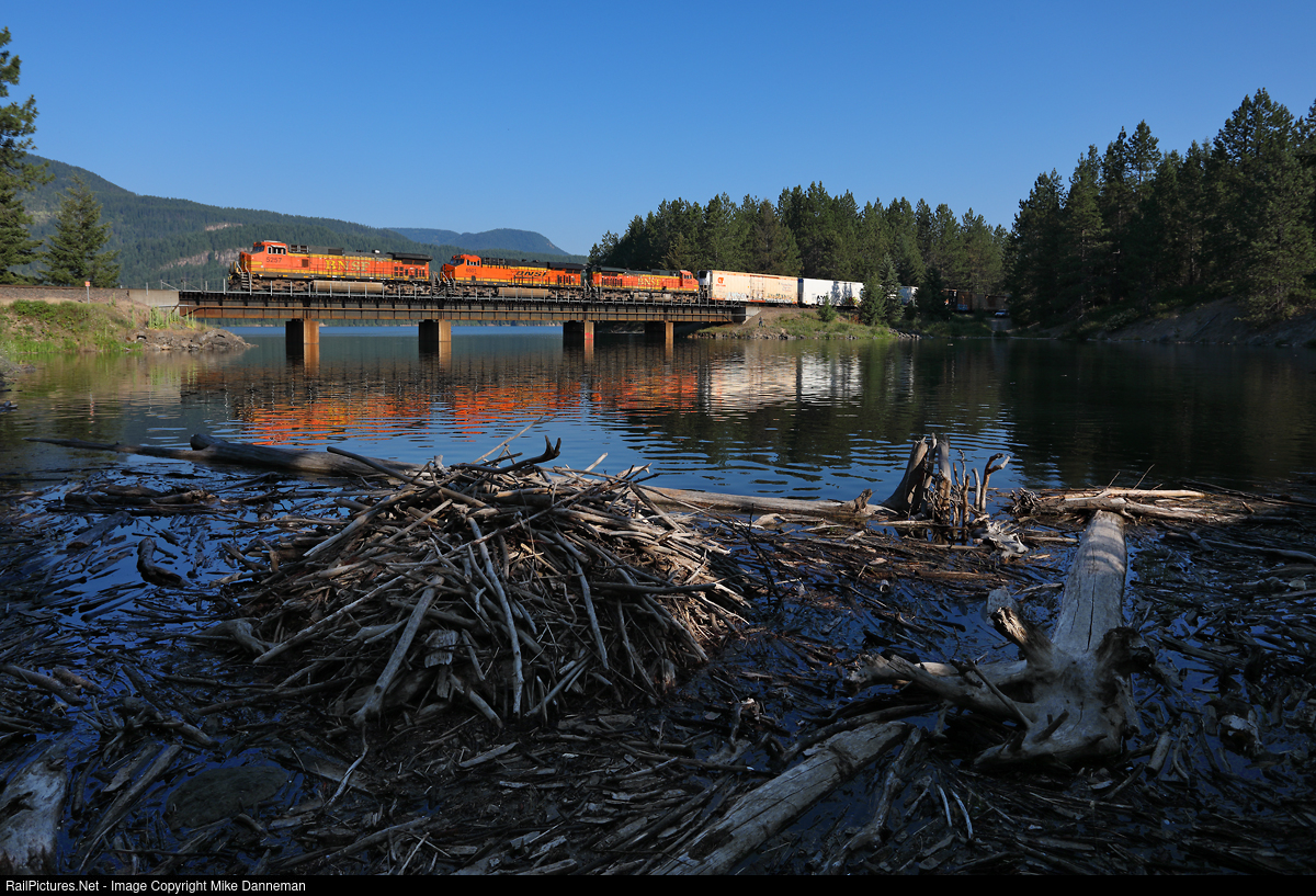 An eastbound BNSF manifest freight crosses Bridge 62 at Tuscor, Montana, on the morning of July 4, 2021. A beaver lodge has recently been constructed at this location where Swamp Creek empties into the Clark Fork.