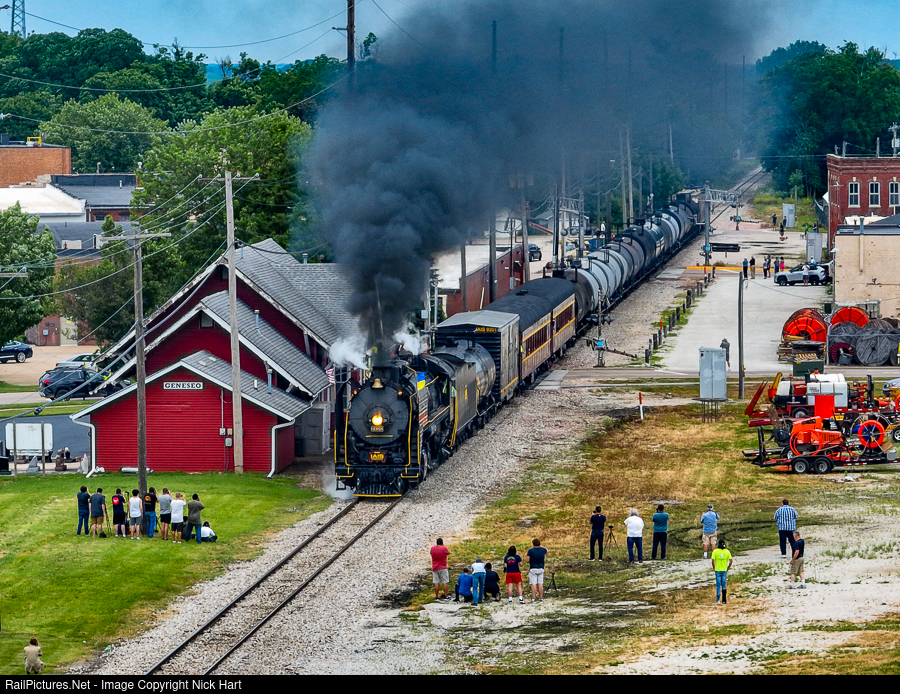 | IAIS 6988 storms east through Geneseo, passing the nicely restored depot. The QJ ran a couple excursions this weekend before heading into the Silvis shop for a restoration. |