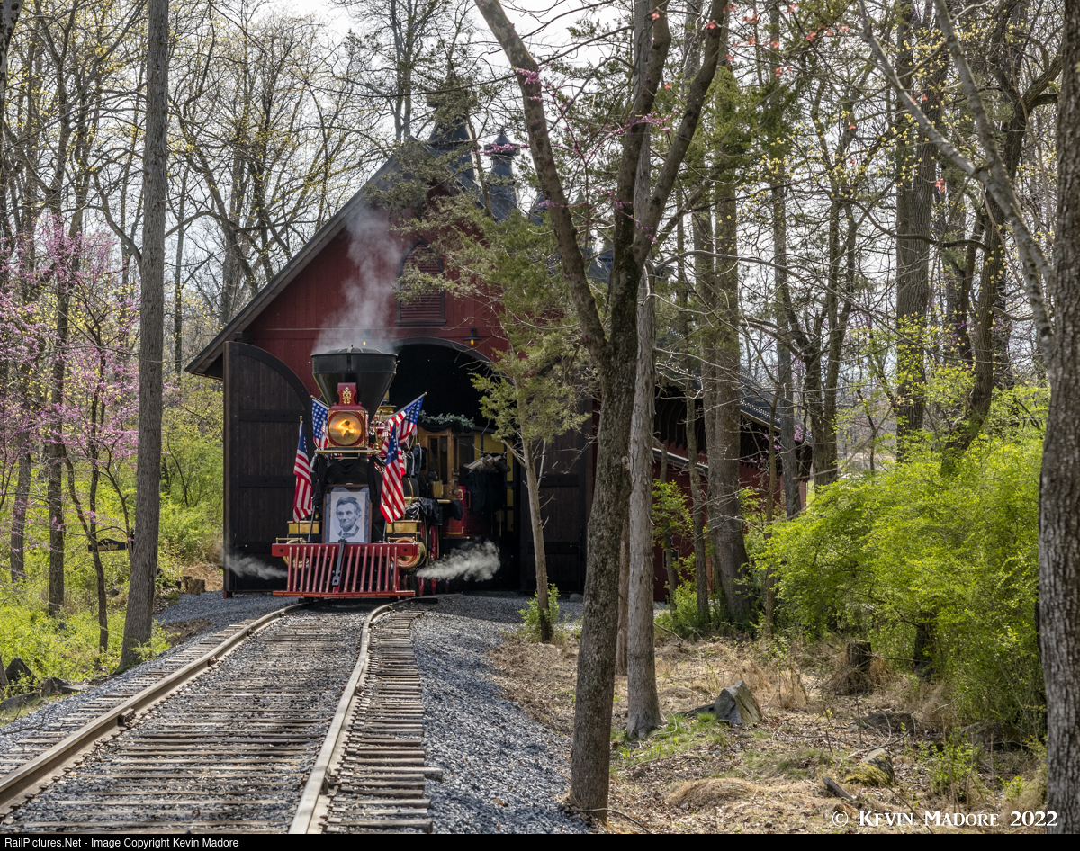 Leaving quarters. With cylinder cocks open, the replica Lincoln Funeral Train at Stone Gables Estate prepares to leave its train shed at the west end of the line, on April 22, 2022, the 157th anniversary of the day that Abraham Lincoln's Funeral Train passed through this very spot.