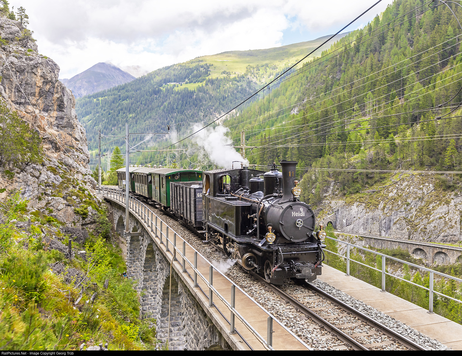 Lightoil fired steamlocomotive G 3/4 ## 11 "Heidi" of the Rhaetian Railway is on a transfer run from Landquart over the Albula line to Samedan, with cars L # 6603, baggage F # 4, third class C # 32 of the former Landquart-Davos Bahn and third class C # 66. The train is crossing the 74 meter long Rugnux viaduct. On the right, you can see the track with the portal of the Fuegna tunnel, where the train run 3 1/4 minutes before. Now the train had gained hight by running through the 662 meter long Rugnux spiral tunnel.