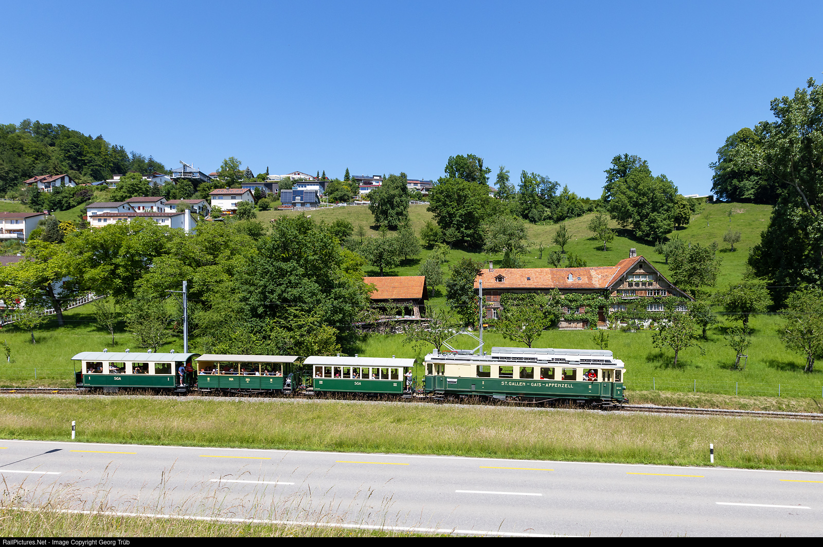 | To celebrate 175 years railways in Switzerland, there were several nostalgic trains running on the Appenzeller Bahnen, line Gossau-Herisau-Wilen. Cogwheel railcar BCFeh 4/4 # 5 of the former St.Gallen-Gais-Appenzell Bahn (SGA) is pulling third class car B # 119, open summer car C # 203 and parlor car A # 101 from Herisau to Gossau. |
