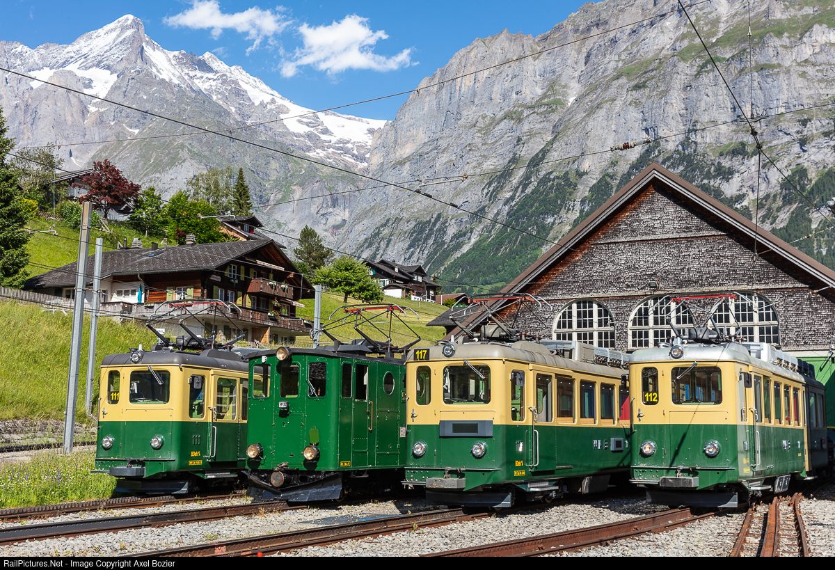Cogwheel railcar BDhe 4/4 #111 of the WAB, built in 1960 by SLM and BBC together with similar railcars #117 (1964) and #112 (1963) in front of the WAB depot in Grindelwald Grund. On the second track, the cogwheel locomotive He 2/2 #53 built in 1909 by SLM and Alioth can be seen, it ran a photo train on this day.