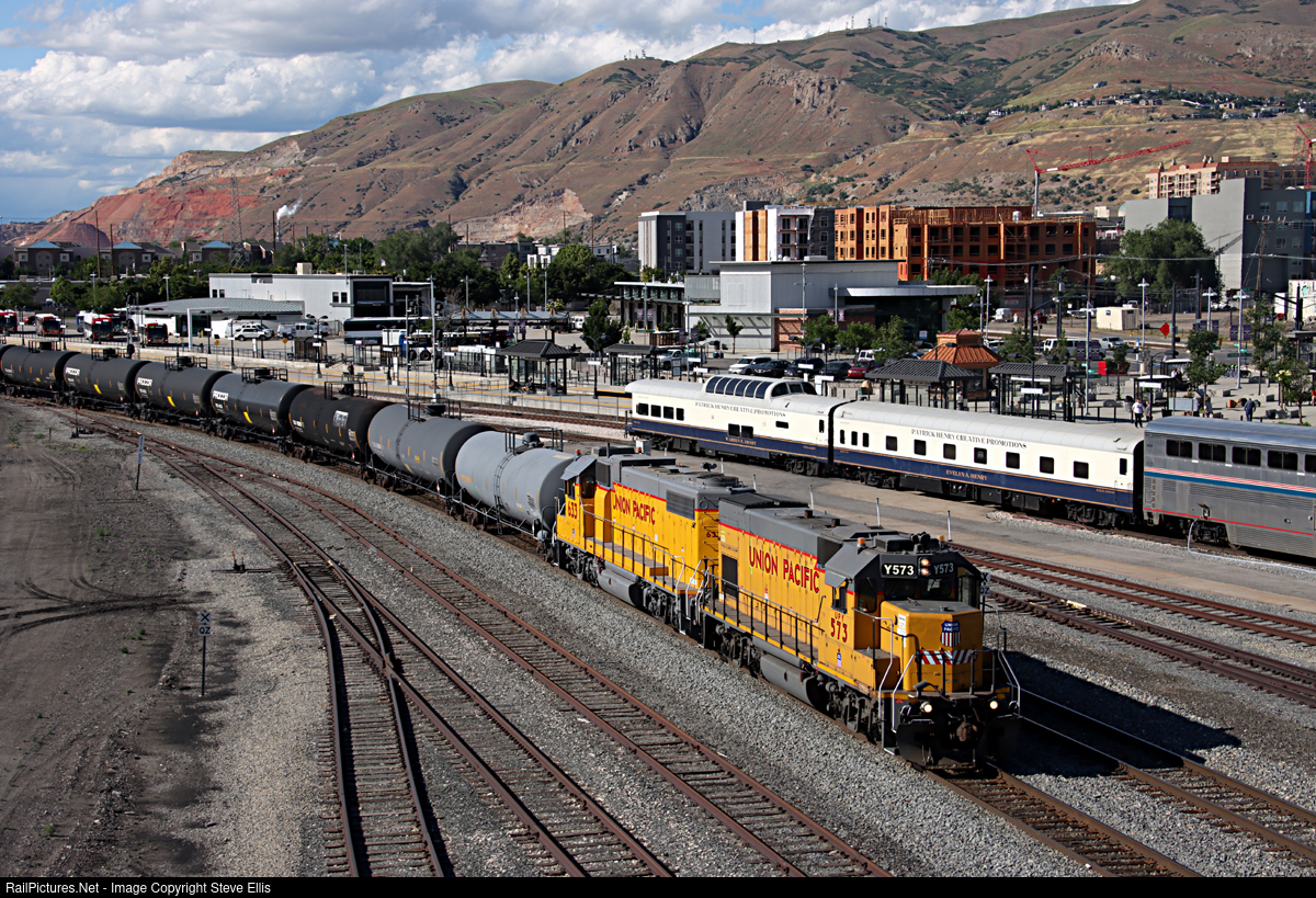 UPY 573, and what looks like a freshly painted GP38N 633 of Missouri Pacific heritage, with the Chevron Local. Passes a 14 hour late Amtrak number 6. On the rear private cars of the Patrick Henry Creative Promotions, Evelyn A Henry, and Warren R Henry. I believe these cars were part of the old American Orient Express.