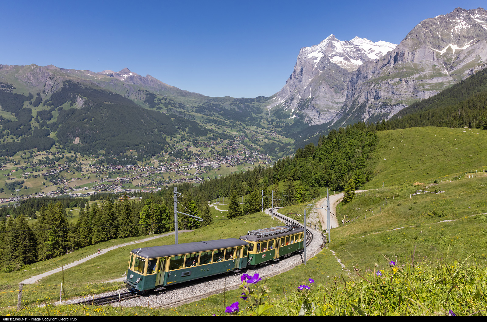 | Relief train for CC 460 Kleine Scheidegg-Grindelwald, running some minutes ahead from Alpiglen to Grindelwald Grund, with coghweel railcar BDhe 4/4 # 111 (built 1960 by SLM and BBC) and cab car Bt # 212. The train just left Alpiglen, with the Wetterhorn and Rosenhorn in the background and Grindelwald in the valley floor. |