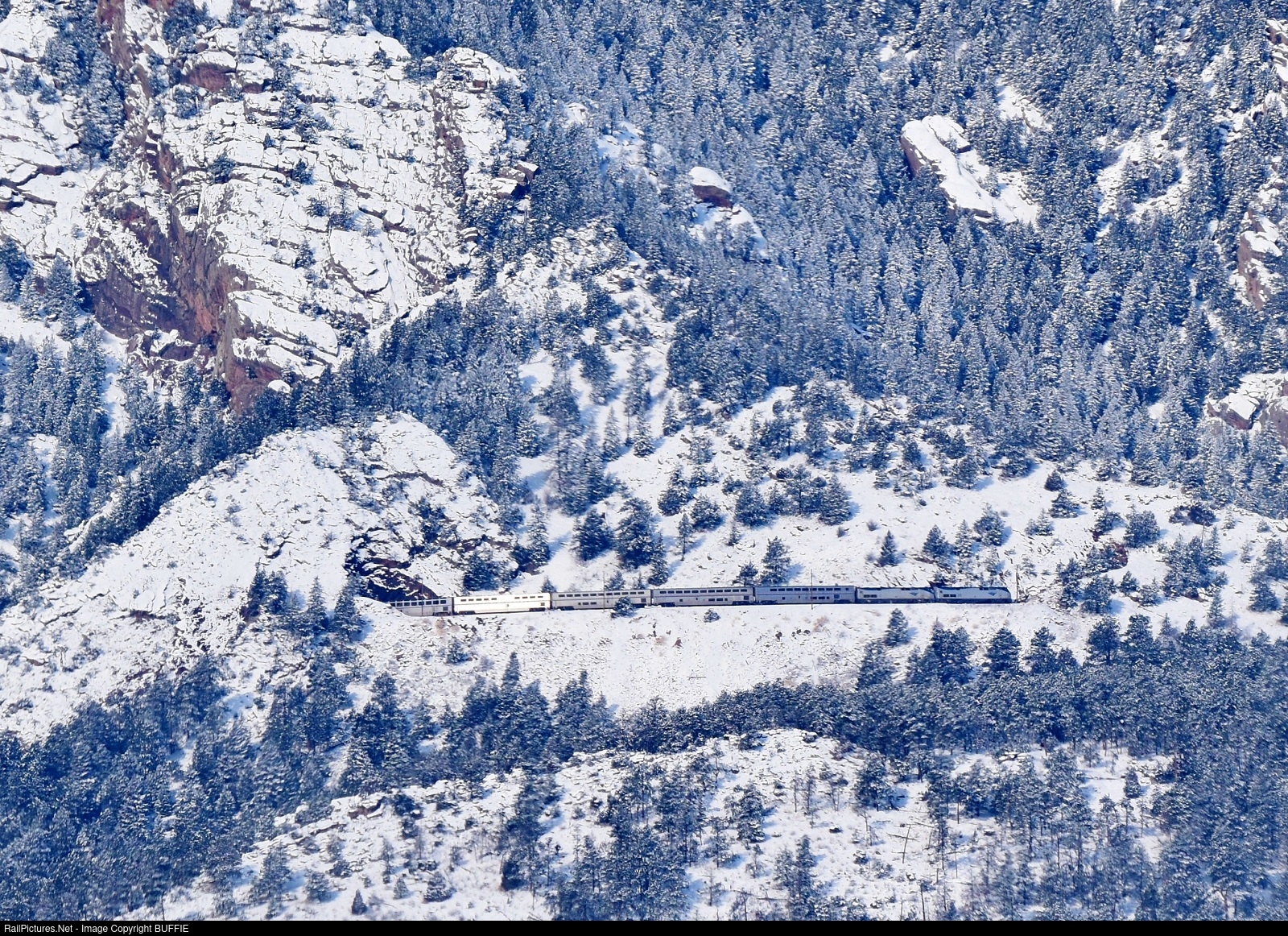 Heavy snow has coated the Boulder Flatirons rock formation as the California Zephyr makes the trek into the Moffat Tunnel Sub.