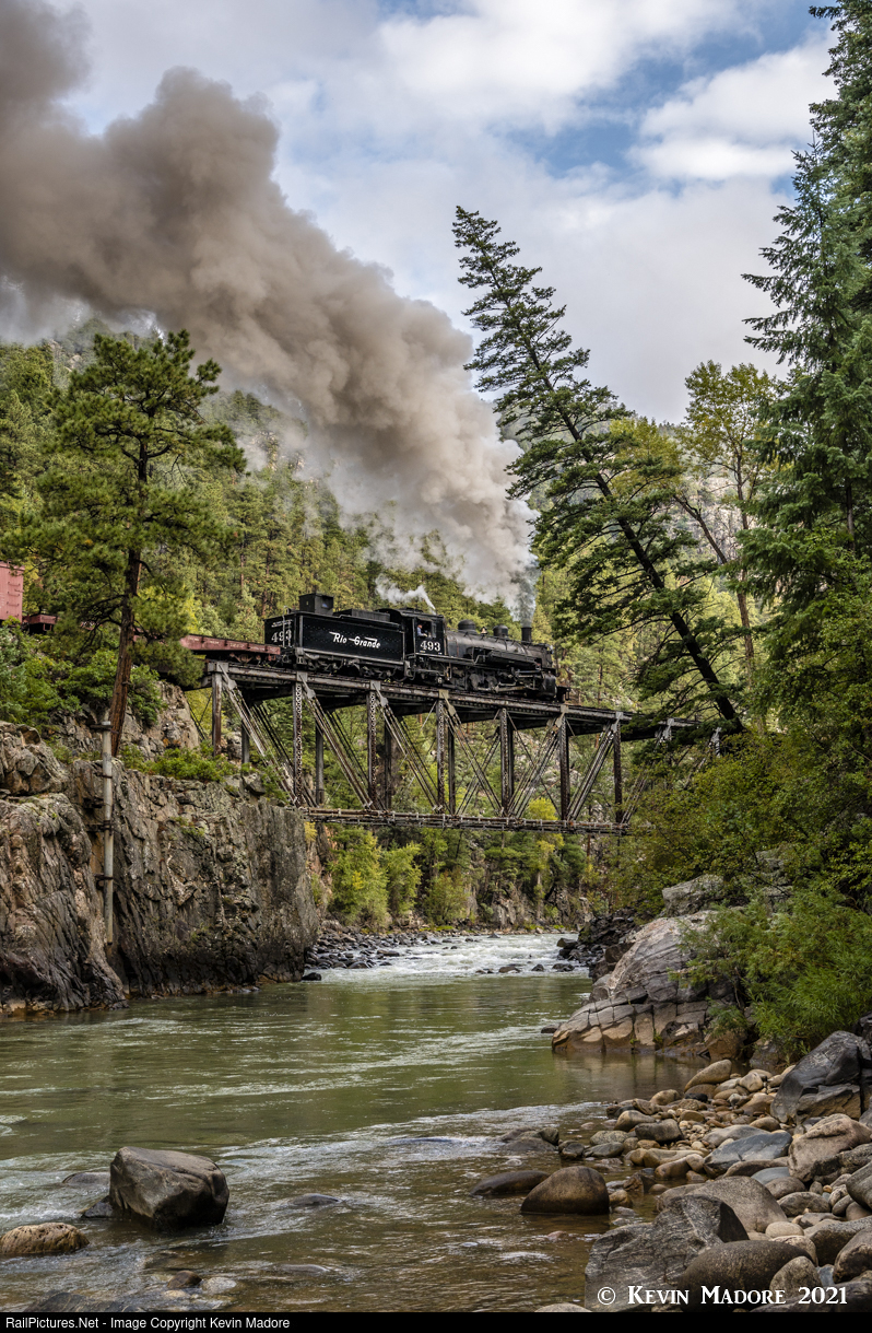 Second Animas Crossing: The High Bridge. Here's a downstream view of the former D&RGW K-37 Locomotive #493, as she crosses the High Bridge at Tacoma (MP 471.23) northbound, with a Silverton mixed consist. This is the second of seven crossings that she'll make as she winds her way through the Animas Canyon from Durango to Silverton, CO. The 493 is only the second K-37 to ever venture this far north on the Silverton Branch. Until the D&RGW sold the railroad to the newly-formed Durango & Silverton Narrow Gauge Railroad, the heaviest locomotives to run this line were the Alco K-28s, sometimes called the "Sports Models." After Charles Bradshaw purchased the operation, some excavation was done on the tighter rock cuts and the bridges along the line were reinforced to deal with the heavier weights of the big K-36s and 37s. A close look at this bridge does reveal bracing wires and other structural members that clearly were not part of the original design.