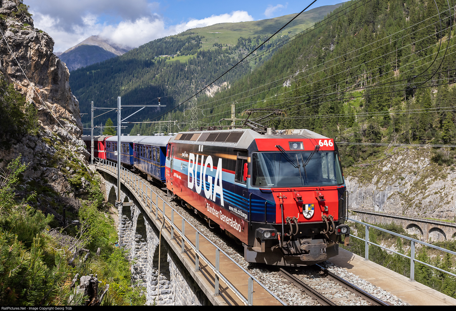 | Ge 4/4 III # 646 of the Rhaetian Railway, in the publicity paint scheme for the BÜGA (Travelcard for Grisons), is on the rear of the Interregio 1152 from St.Moritz over the Albula line to Chur. The train is on the 74 meter long Rugnux viaduct in the spirals between Preda and Muot. On the right you can see the track were the train will run in about one minute from now, after passing the Rugnux spiral tunnel. |