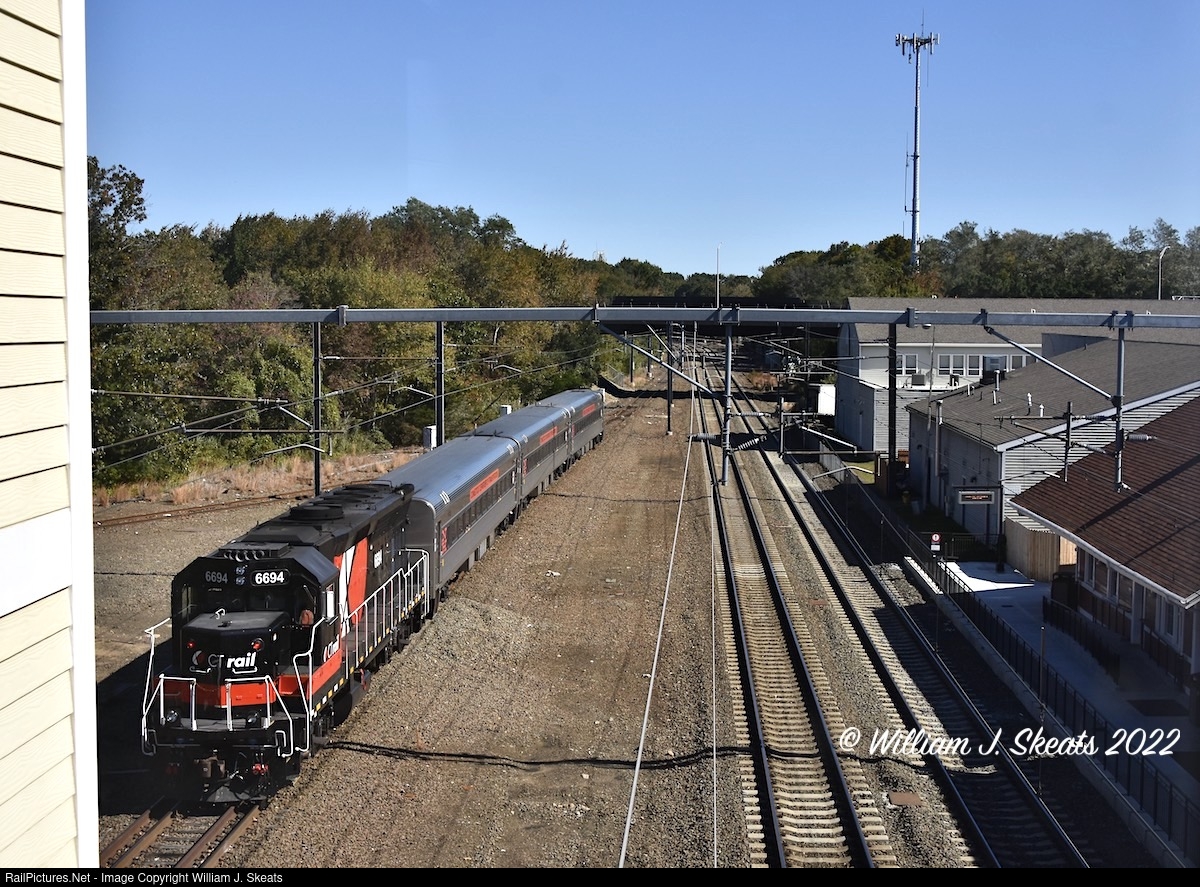 Viewed from the Old Saybrook Station overhead bridge connecting track 2 to track 3/1. Train 3610 after arrival at Old Saybrook is laying over east of station. Waiting to turn as Train 3637 to New Haven. This run was extended to New London the following year.