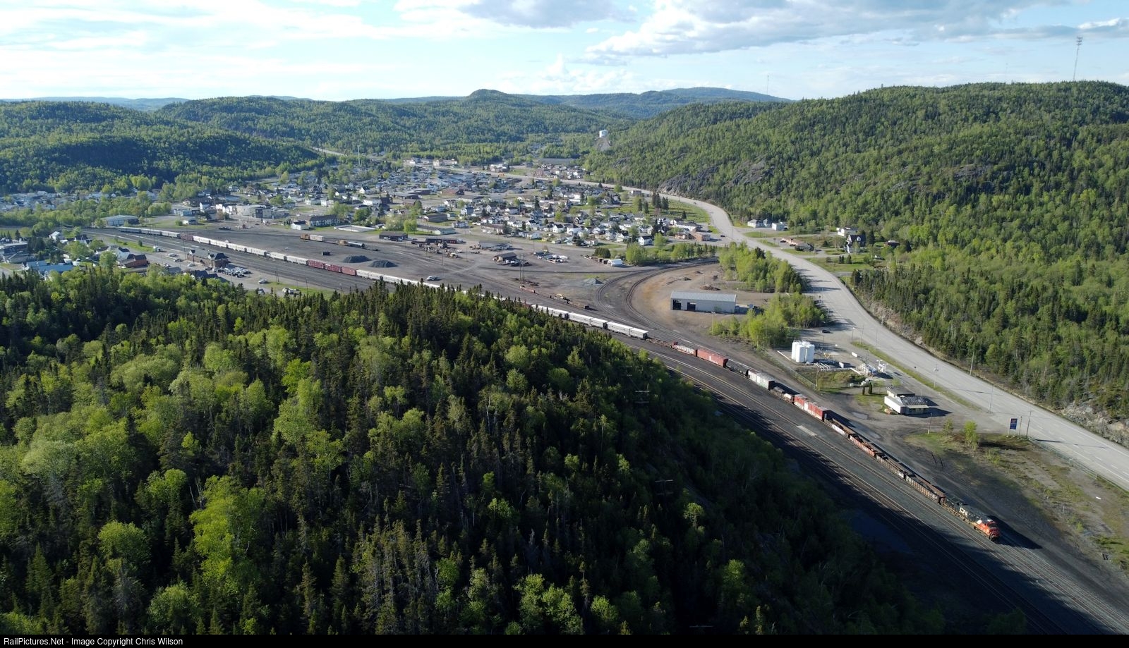 | CN ET44AC 3144 looking out of place ready to haul a boarding car move east to White River. A nice "birds eye" of Schreiber showing what is left from this once busy terminal. Imperial Oil and Shell both had spurs as well as a mining ore concentrate loadout. (which may reopen in the near future) Quite a few yard tracks have been eliminated with the downturn of local industries. The Schreiber station still proudly stands off to the center left. |