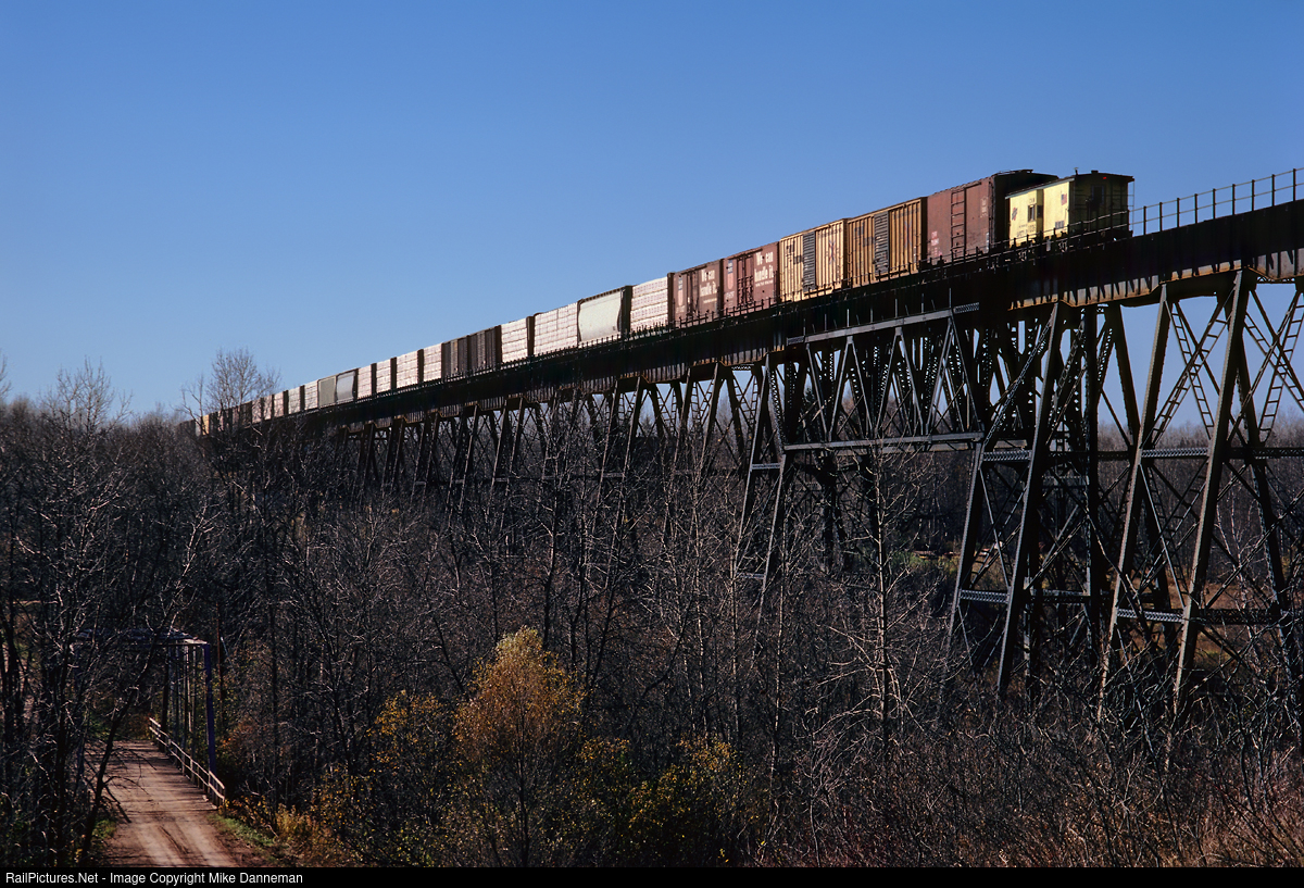 A bay-window waycar (caboose) trails a southbound Chicago & North Western freight as it crosses the lengthy Nemadji River Bridge at Boylston, Wisconsin, on October 19, 1985. This train is operating on Burlington Northern’s former Great Northern Hinckley Subdivision, but BN will soon acquire and utilize Soo Line’s parallel route and abandoned this bridge for Soo’s Nemadji River crossing out of Boylston.