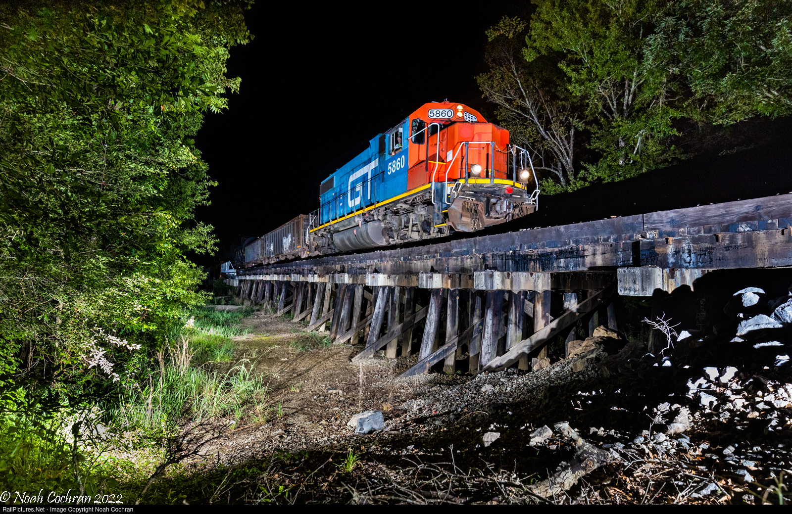 The humid evening still is briefly disturbed as CN's Hattiesburg, MS - Evanston, MS turn L543 rolls south across the Pascagoula River in Merrill, MS along the CN Beaumont Subdivision. Leading the train solo is GTW GP38-2 #5860, still wearing GTW's red/blue scheme.