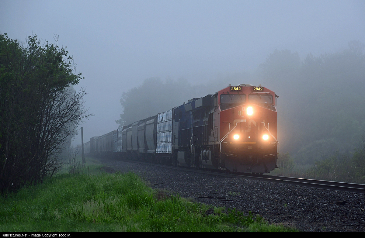 Through the fog comes another southbound freight from Canada rolling along the CN Rainy Sub..