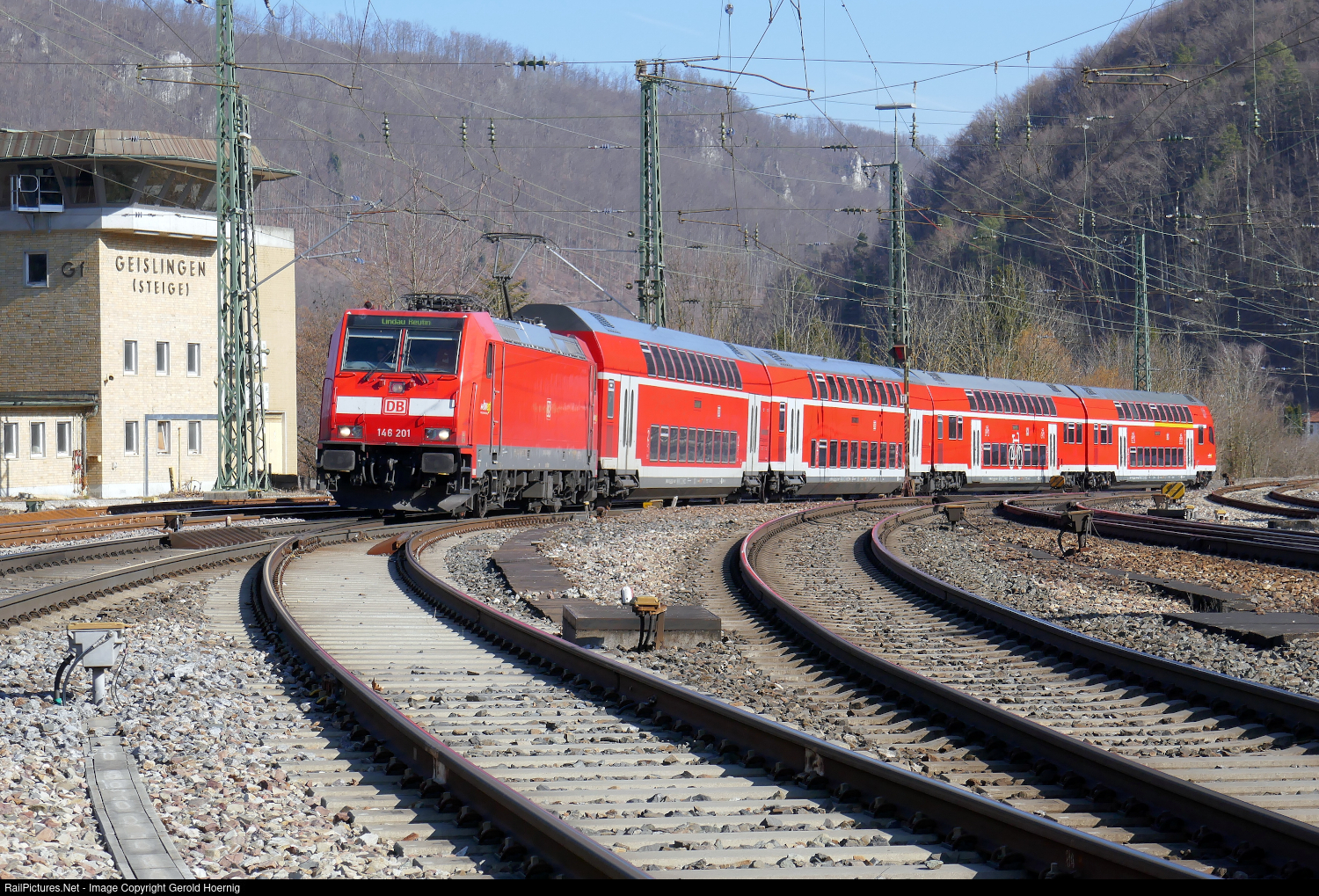| Locomotive 146 201 is entering the station of Geislingen (Steige) with a RE5 Service from Stuttgart (Baden Würtenberg) to Lindau (Bavaria) on Lake Constance. The photo shows quite an "iconic view" of german railroads. Ahead of the train lies a short climb to the top of the "Schwäbische Alb", hence "Steige" in the name of the location. |