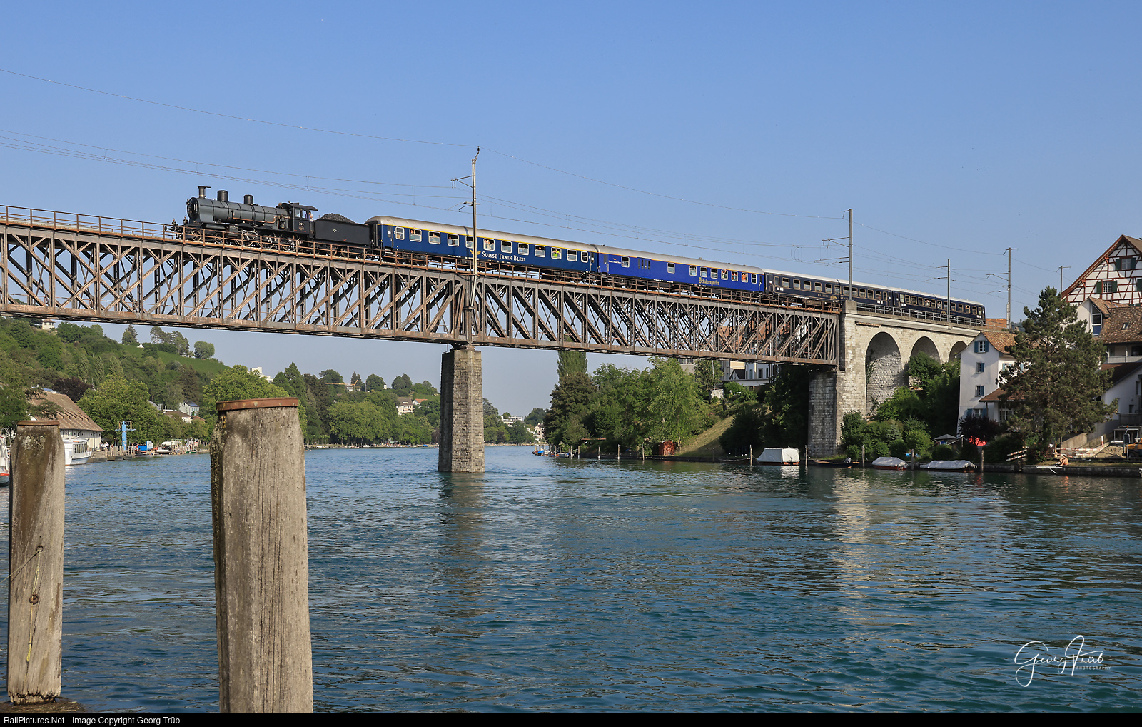 The elegant 4-6-0 fourcylinder compound express train steamlocomotive A 3/5 # 705, built by SLM in 1904, on long term loan from SBB Historic to the steam group Zürich (VDZ Verein Dampfgruppe Zürich), made the first public trip after the large revision. The train of ZRT Bahnreisen/RailEvent is crossing the 262 meter long Rhine bridge between Feuerthalen and Schaffhausen. The train came from Singen (Hohentwiel)/Germany via Rielasingen-Ramsen-Etzwilen, and is on the way via Schaffhausen-Eglisau-Bülach-Regensdorf to Baden, and finally to Oensingen.