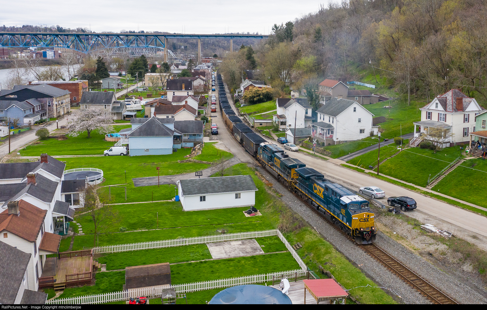 | After getting a crew change at the south end of town, CSX loaded coal R129 heads towards the bridge to cross the river and turn south. With the freshly repainted AC4400 on the point, the power is just coming off the street running down Main Street in West Brownsville, Pennsylvania. |