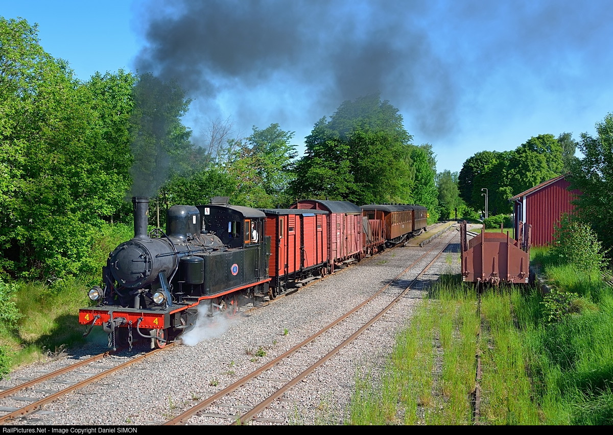 | #4 is leaving the Lundsbrunn station with a mixed train to Skara. The locomotive has been built in 1899 by Motala in Sweden and previously belonged to the Västergötland Göteborg Järnväg railway company. The gauge of the line is 891 mm. |
