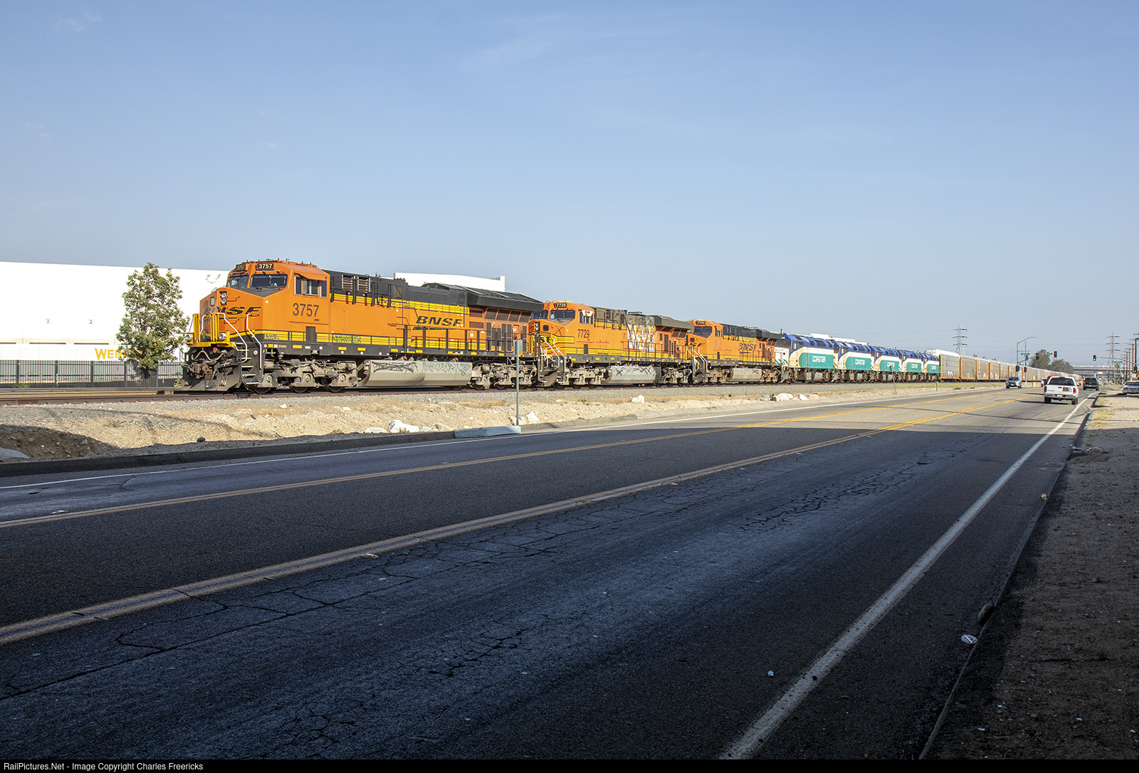 An auto train bound for Barstow from San Diego, awaits a new crew at Ono. Behind the BNSF power are Coaster's five F40PH-2Cs, on a very circuitous route from San Diego to Anaheim (which they passed by already many miles back). Because of how BNSF works, in order to get the retired engines switched into the scrapyard, they have to go all the way to Barstow, then be brought down to La Mirada, and only from there be pulled back to Anaheim. Rumor has it that three are going to be scrapped and two will go to museums.