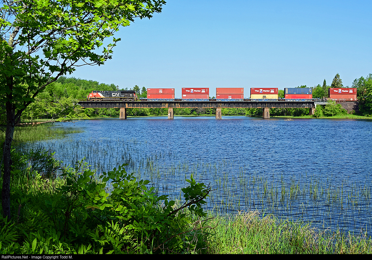 | A stack train heading south on the CN Rainy sub crosses over the Cloquet River near Twig, MN on a hot and muggy morning. Disclosure-there were many many mosquitos killed in the taking of this photo. |