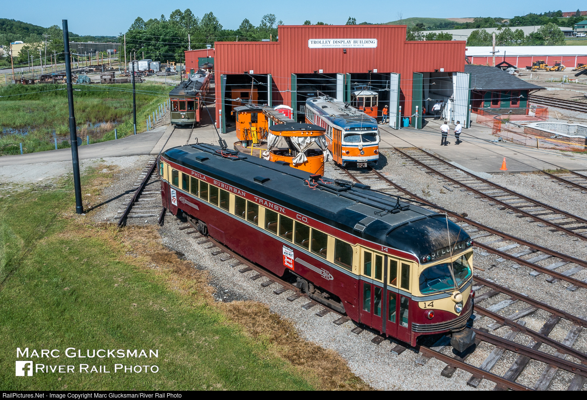 Museum In Motion. Multiple cars were in motion outside the Pennsylvania Trolley Museum’s Trolley Display Building on Saturday, June 4, 2022 as the Trolley Parades were being arranged. With Philadelphia Red Arrow 14 in the foreground, and Pittsburgh M283, Red Arrow 26, New Orleans 832, and Cincinnati 2227 in the background, there is a significant representation of cities.