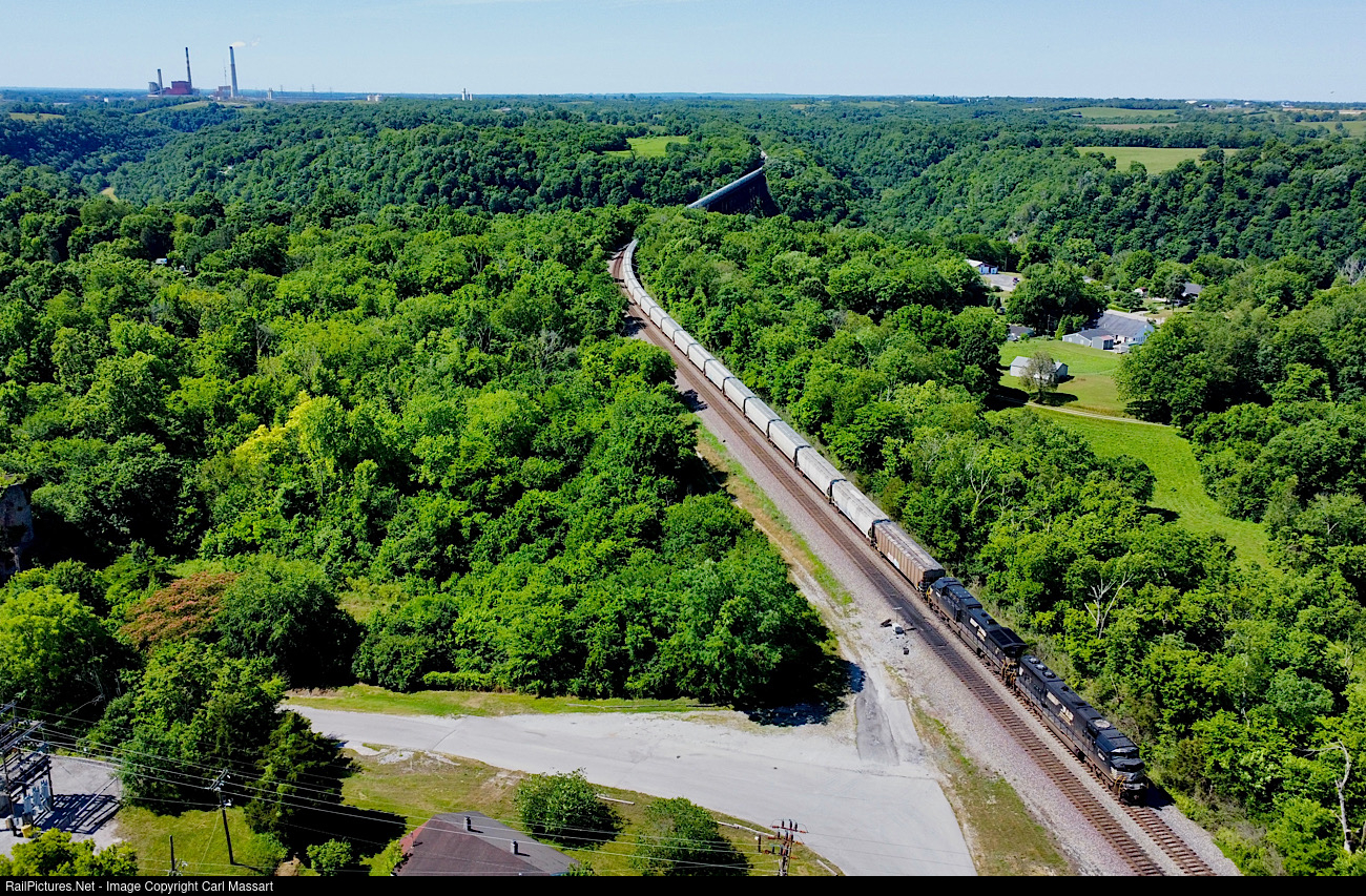 | Held up in High Bridge. A Cincy bound grain train stretched out across the Kentucky High Bridge is tied down awaiting a new crew. In the background is the E. W. Brown generating station. It is unique in the fact that it uses four different sources of fuel. There is a solar array onsite, a hydroelectric dam, a natural gas fired combined cycle plant and the original coal fired power plant which hopefully stays running for grid stability. |