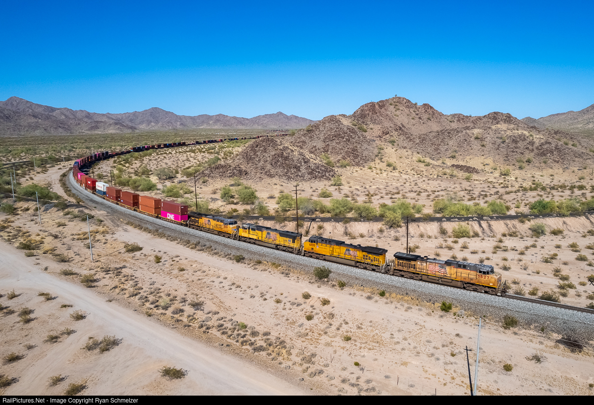 | Four locomotives bring a stack train downgrade through Shawmut towards Gila Bend. The original Southern Pacific alignment of this line is seen crossing the current line across the frame. |