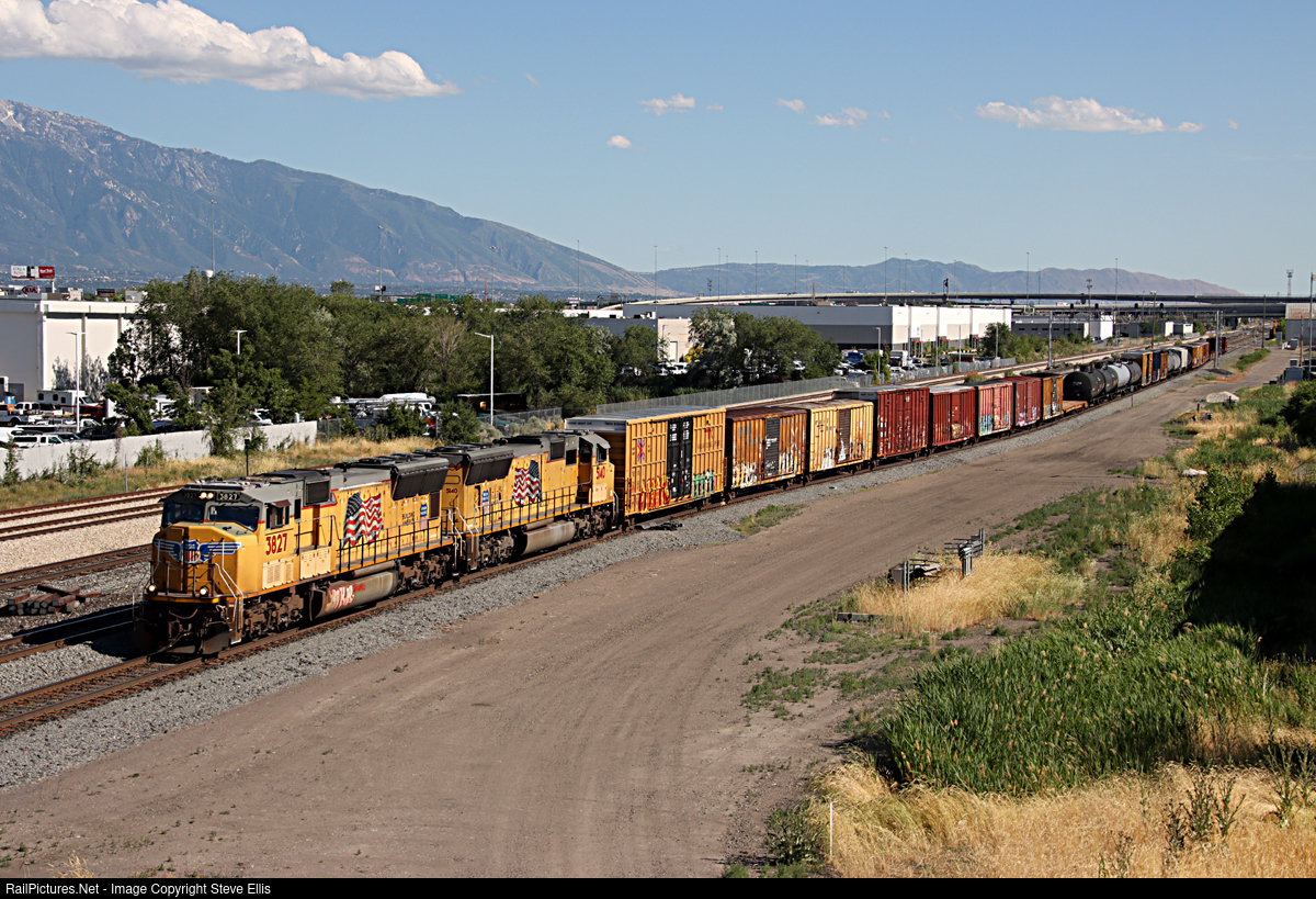 | With a former Missouri Pacific caboose out front as a shoving platform. The LUE43 local shoves back into Roper Yard. The LUE43 works the industrial park on Salt Lake Cities westside. It pretty much always uses a shoving platform. The power leads eastbound. then at Grant tower they will pull north. Then reverse for the trip into Roper yard. |
