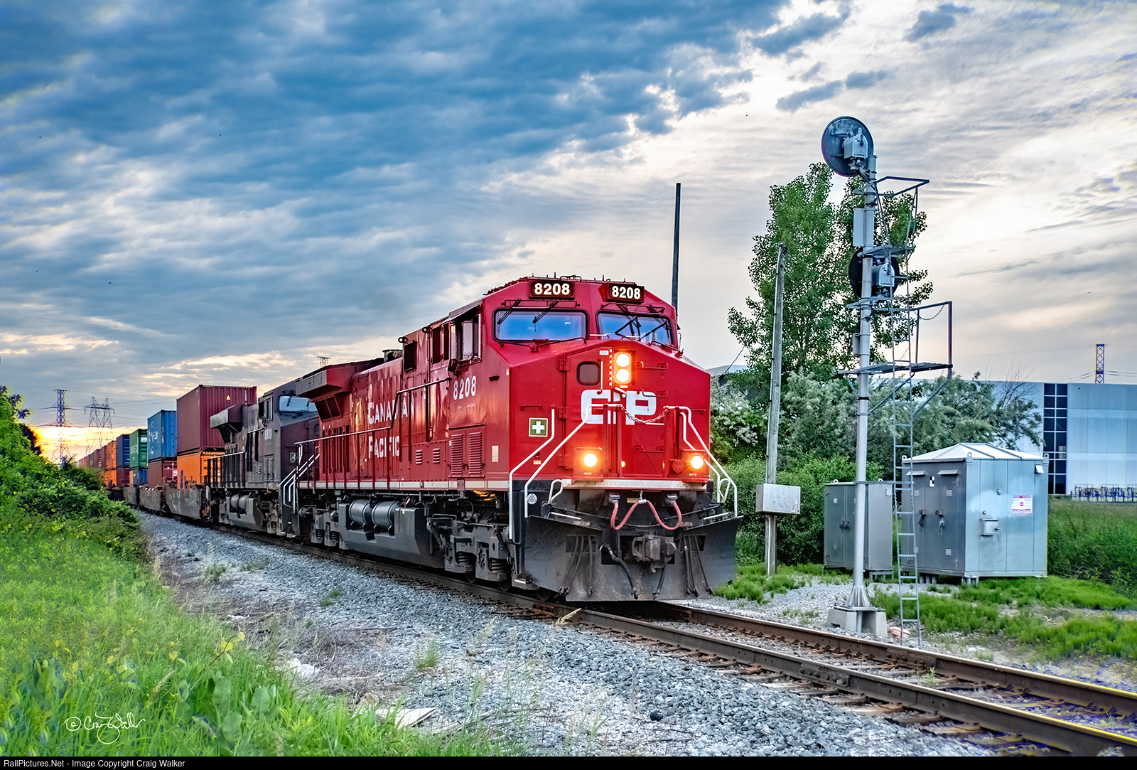 Pulling out of Canadian Pacific's Toronto Yard, on the Staines Connecting Track, is an eastbound freight (double stacks up front, mixed freight on the latter half) with one-year-old CP AC4400CWM 8208 (ex-CP AC4400CW 8560) and ES44AC 8939 on the head end, and CP AC4400CWM 8013 (ex-AC4400CW 9516) in the middle, between the stack cars and the "loose car" section. (Scarborough, Ontario, Canada - June 13, 2022)